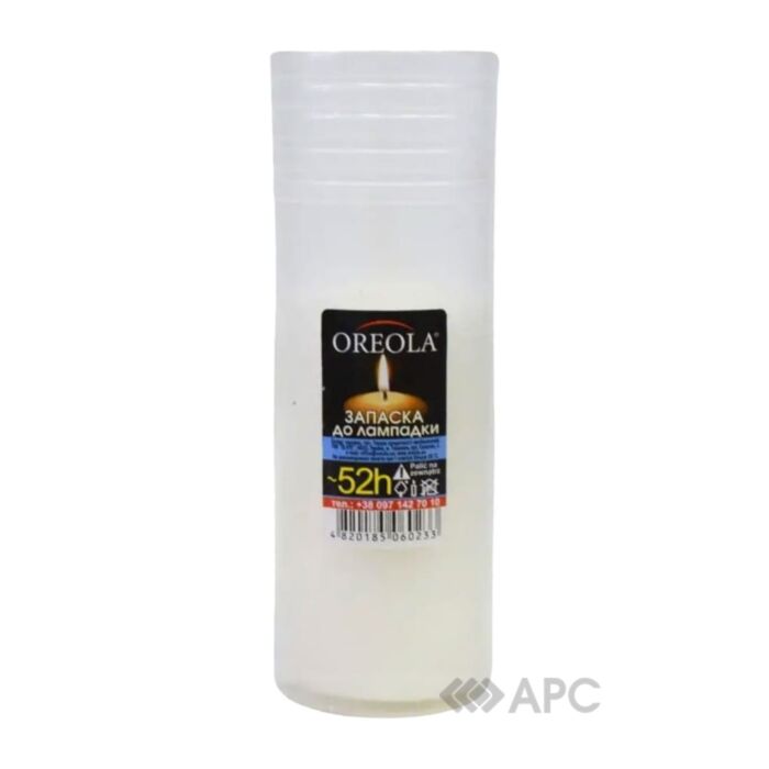 Запаска для лампадки Oreola 52 години — змінна свічка для скляних та пластикових лампад, що найчастіше використовуються в християнській традиції вшанування померлих близьких та рідних. Парафінова вставка поміщена в пластиковий корпус тож свічка легко запалюється і не гасне навіть від поривів вітру. Розмір моделі та просочення ґнота спеціальною сумішшю зумовлюють можливість безперервного горіння виробу впродовж 52 години. Може використовуватись як звичайна свічка для домашнього вжитку. Продукція українського бренду характеризується високою якістю та реалізується за доступною ціною.
