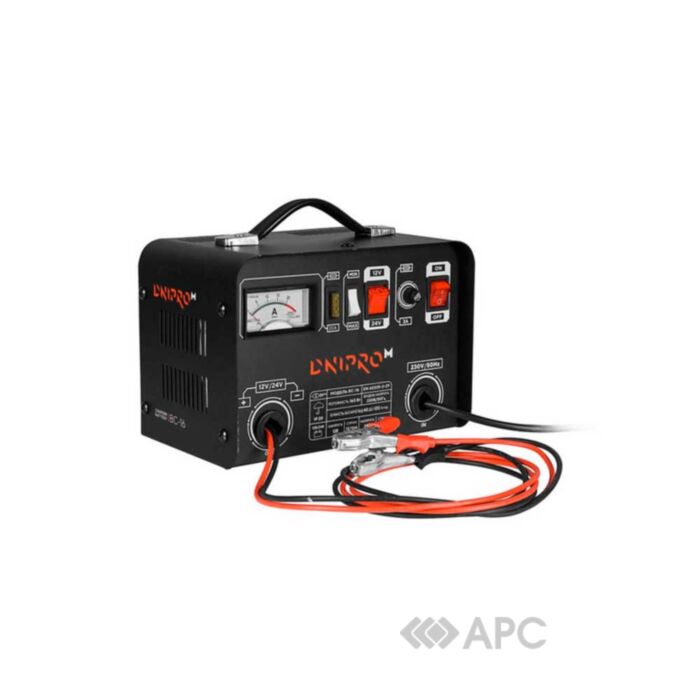Зарядний пристрій ДНІПРО-М ВС-16 – незамінний і надійний помічник для якісної і швидкої зарядки автомобільного акумулятора чи інших носіїв з ємністю 45-120 A*год. Ергономічний корпус виконаний з металу, він захищає внутрішні елементи від пошкодження внаслідок падіння або удару. Вага агрегату в 6 кілограм сприяє комфортному транспортуванню, зберіганню і експлуатації в обмежених по площі місцях. Для зарядки батареї один електропровід підключається до розетки 220 Вт/50 Гц, інший – зажимами «прищіпками» до розрядженому акумулятору. Весь процес триває близько 60 секунд, перемиканням ключа «MIN-MAX» можна вибрати «повільний» або «швидкий» заряд – 9 або 12 Ампер. У пристрої DNIPRO-M ВС-16 впроваджені захисні системи, що попереджають неправильне підключення до клейм та можливе перевантаження. Для візуального контролю сили струму на панелі управління поміщений амперметр. Відзначимо високий клас захисту від ураження струмом – 23IP та H-ізоляцію еластичних проводів, яким не страшна підвищена вологість і негативна температура навколишнього середовища.