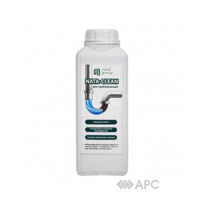 Засіб чистячий NATA-Clean для трубопроводів швидкої дії ефективно видаляє жирові відкладення, органічні забруднення у каналізаційних трубах. Безбарвна рідина без вираженого запаху ідеально підходить для застосування на кухні та у ванній кімнаті, легко усуває неприємний запах, зумовлений забиванням сифонів. Для одноразового використання достатньо 200-250 мл. Завдяки наявності у складі активних компонентів має антисептичні та дезінфікуючі властивості, а інгібітори корозії суттєво сповільнюють процеси іржавіння металів. Об’єм — 1 л.