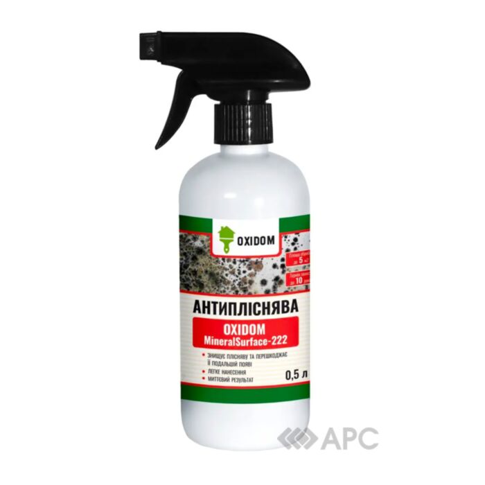Засіб проти плісняви OxiDom Mineral Surface-222 Стоп цвіль 0,5 л - це концентрований водний препарат, розроблений з використанням високотехнологічних компонентів, таких як спецсуміш ПАР, гіпохлорит та стабілізатор. Він володіє високою ефективністю та швидкістю реакції, сприяючи ефективному видаленню грибкових утворень, цвілі, мхів та водоростей.
