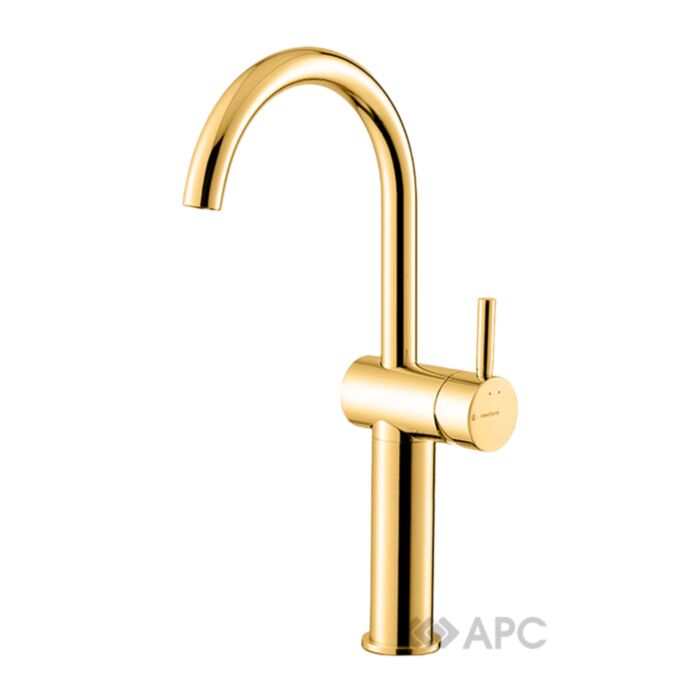 Змішувач для умивальника Newform Blink luxury 70815.61.020 PVD Glossy gold - це одноважільний високий виріб з довгим виливом, спроектований для монтажу над раковиною, без висувної зливної гарнітури.