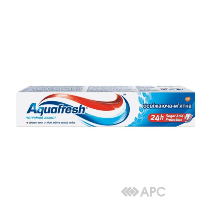 Зубна паста Aquafresh Освіжаюча-м'ята 50 мл дарує свіжий подих та білосніжну усмішку протягом дня. Спеціальна формула якісно очищує, видаляє плями від їжі, повертає природну білизну зубів, укріплює ясна за умови чищення два рази в день. Завдяки додаванню фтору, паста захищає зуби від цукру та кислот, що спричиняють появу карієсу. Покращує якість емалі та додає їй естетичного вигляду. Має приємний м’ятний смак, що надовго залишає відчуття свіжості у роті. Густа консистенція сприяє економному застосуванню засобу. Aquafresh – це дбайливий догляд за порожниною рота та красива посмішка щодня.