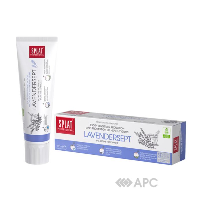 Зубна паста Splat Professional Lavendersept 100 мл – це біоактивний засіб для щоденного догляду за чутливими зубами. Має у складі кальцій, що відновлює зубну емаль, тому гаряча чи холодна їжа не буде створювати дискомфорту та неприємних відчуттів при умові використання пасти двічі на день. Натуральний фермент папайї розчиняє і видаляє зубний наліт, залишаючи поверхню зубів чистою та блискучою. Ефірні олії лаванди та розмарину знімають запалення та знищують бактерії, що викликають карієс. Екстракт бергамоту зміцнює ясна, знижує їх кровоточивість та нейтралізує поганий запах. Splat Professional Lavendersept – надійний помічник у збереженні чистоти та здоров’я ротової порожнини.