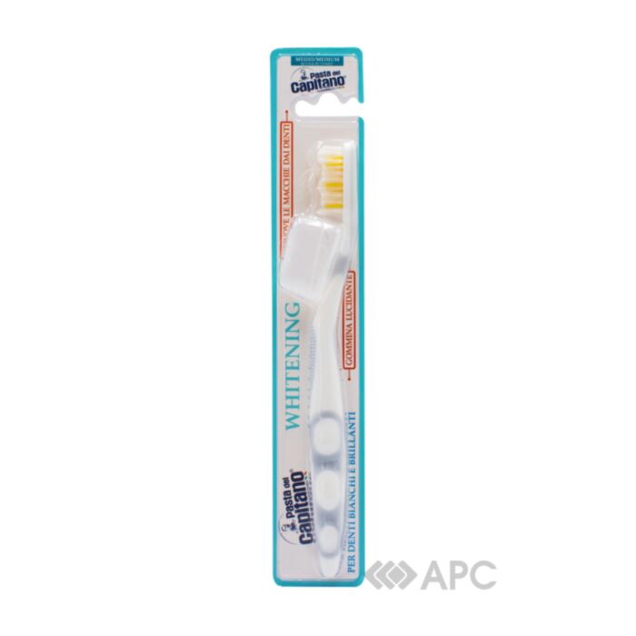 Зубна щітка Pasta Del Capitano Whitening Medium з м’якою щетиною Tynex з хвилястого каучуку забезпечує ефективне видалення зубного нальоту та залишків їжі, делікатне очищення, дбайливе відбілювання. Вона м’яко полірує поверхні зубів, не пошкоджуючи емаль, відновлює природну білизну, усуваючи сліди, спричинені регулярним вживанням кави, чаю, інших фарбуючих напоїв та нікотину. Має зручну ергономічну ручку, яка дозволяє легко і комфортно керувати процесом. В комплект входить захисний ковпачок, що перешкоджає потраплянню бактерій, пилу. Завдяки йому щітку зручно брати з собою у подорож.