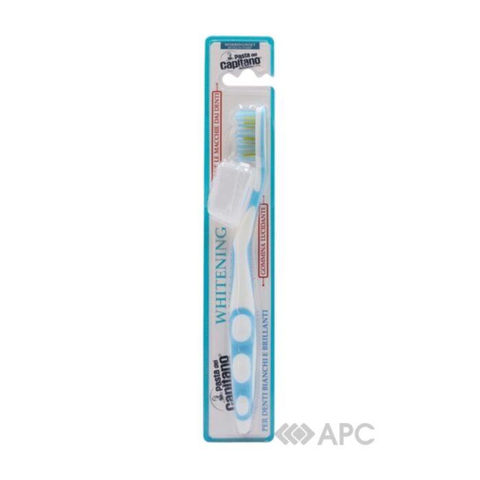 Зубна щітка Pasta Del Capitano Whitening Soft з м’якою щетиною Tynex з хвилястого каучуку забезпечує ефективне видалення зубного нальоту та залишків їжі, делікатне очищення, дбайливе відбілювання. Вона м’яко полірує поверхні зубів, не пошкоджуючи емаль, відновлює природну білизну, усуваючи сліди, спричинені регулярним вживанням кави, чаю, інших фарбуючих напоїв та нікотину. Ідеально підходить для людей з підвищеною чутливістю та проблемою кровоточивості ясен, адже м’яко очищає без подразнень та травматизації. Має зручну ергономічну ручку, яка дозволяє легко і комфортно керувати процесом. В комплект входить захисний ковпачок, що перешкоджає потраплянню бактерій, пилу. Завдяки йому щітку зручно брати з собою у подорож.